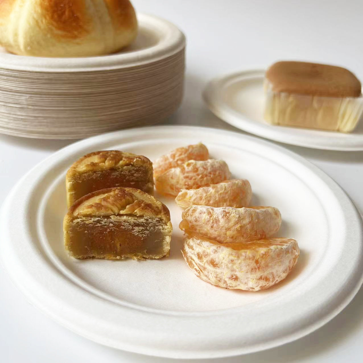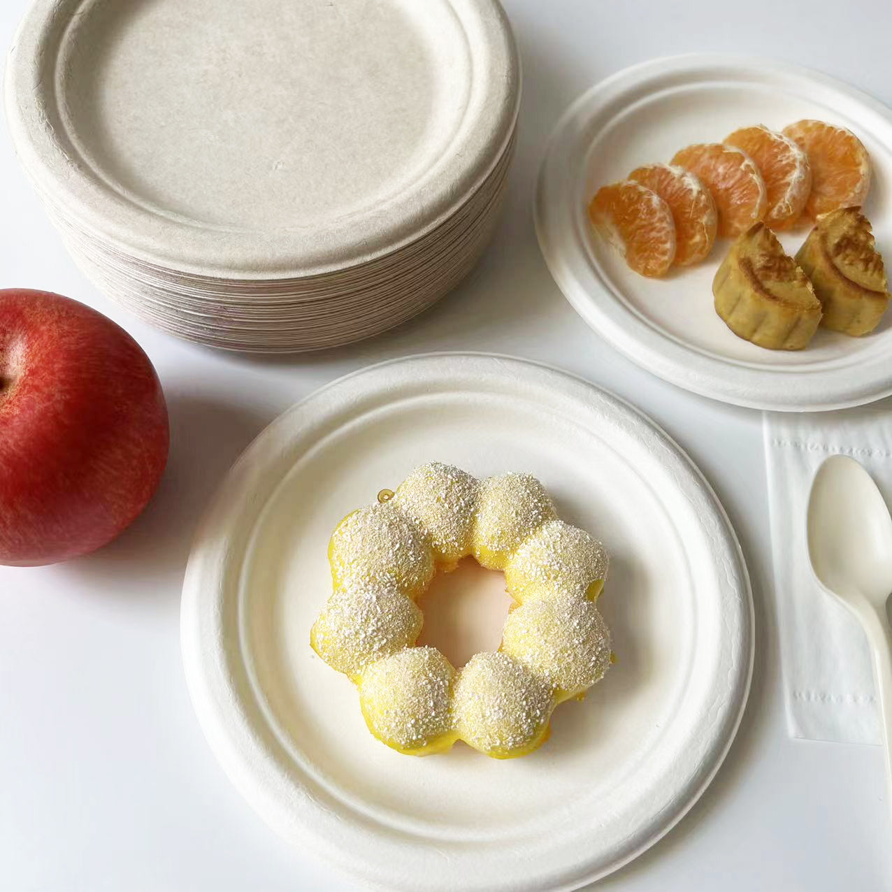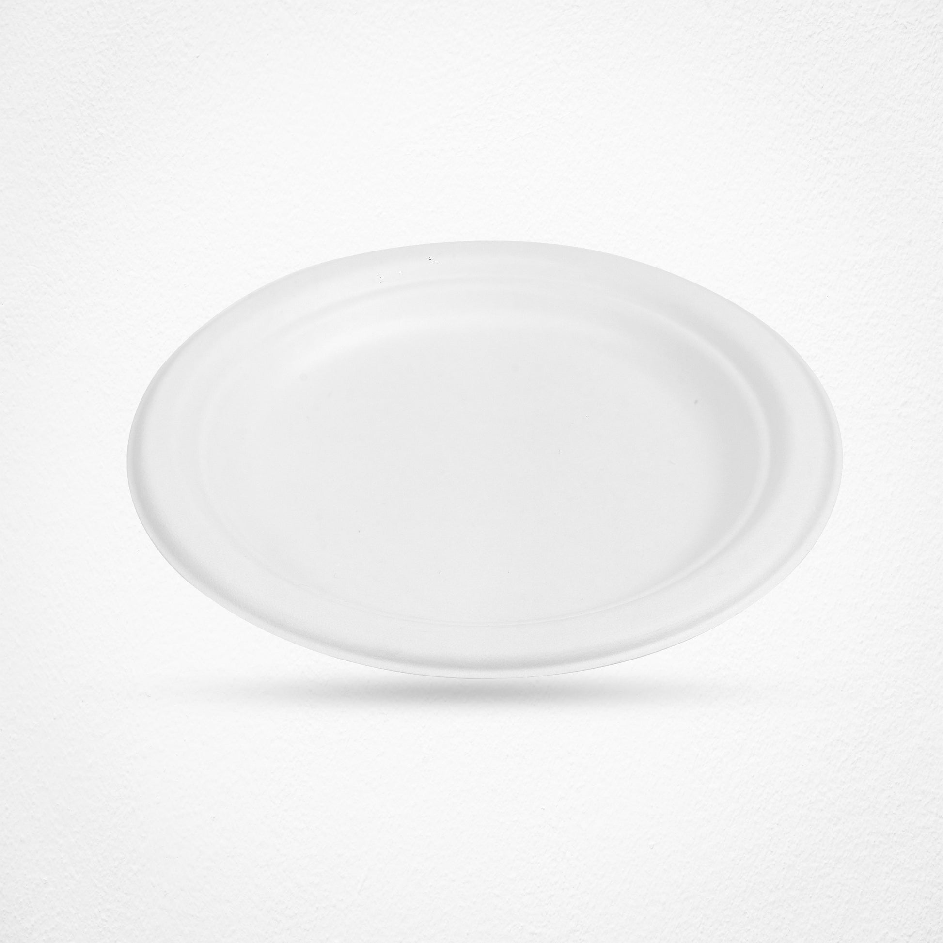 Round Compostable White Bagasse Plates made from Sugarcane fiber. Ideal biodegradable tray for catering and event supplies.